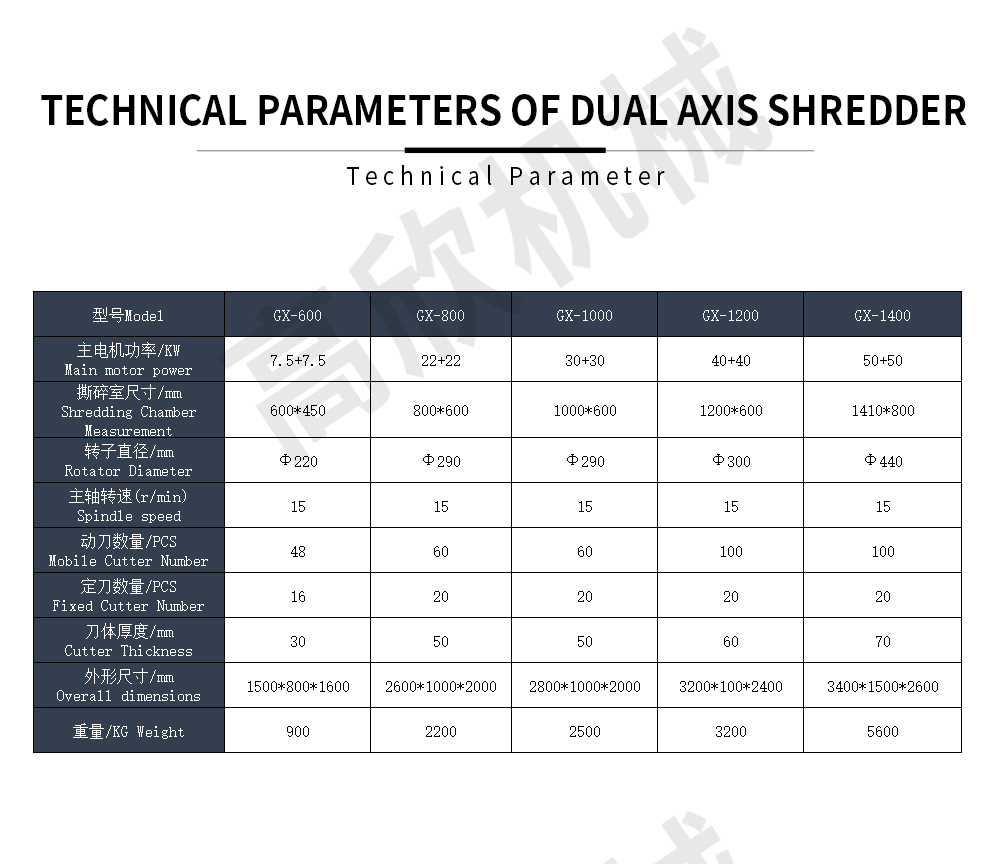 The GX series double-shaft shredder can meet the waste recycling requirements of various industries and is suitable for shredding thick and difficult-to-shred materials such as: electronic waste, hard plastics, metal, wood, waste rubber, packaging barrels, pallets, etc. There are many types of recyclable materials, and the shredded materials can be directly recycled or further refined according to needs. It is suitable for applications in industrial waste recycling, medical recycling, electronic manufacturing, pallet manufacturing, wood processing, domestic waste recycling, plastic recycling, tire recycling, paper making and other industries. This series of double-shaft shredders have the characteristics of low speed, high torque, and low noise. It adopts Siemens programming system and can be automatically controlled and equipped with start, stop, reverse, and overload automatic reverse control functions.